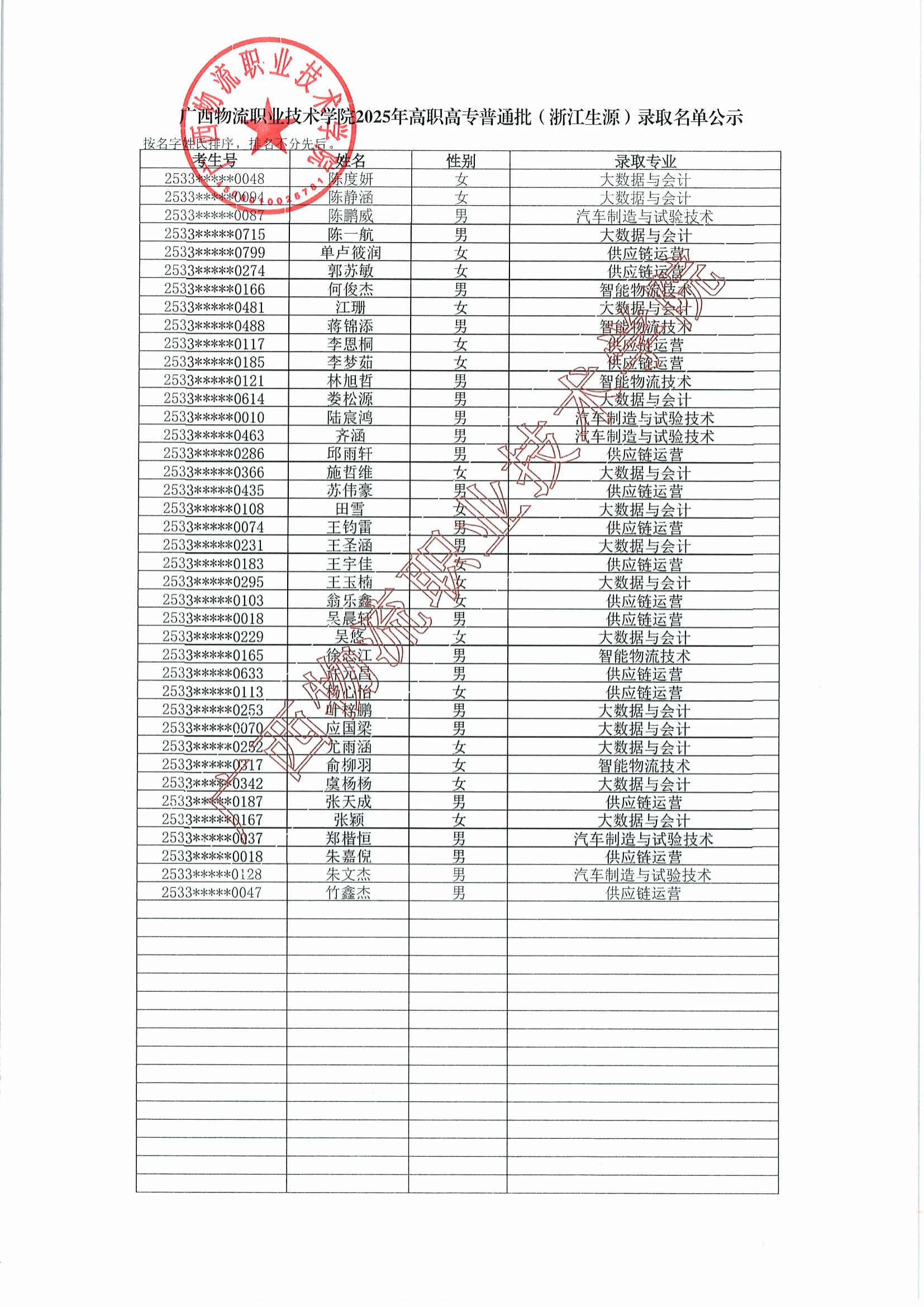 广西物流职业技术学院2025年高职高专普通批(浙江生源)录取名单公示(盖章).pdf