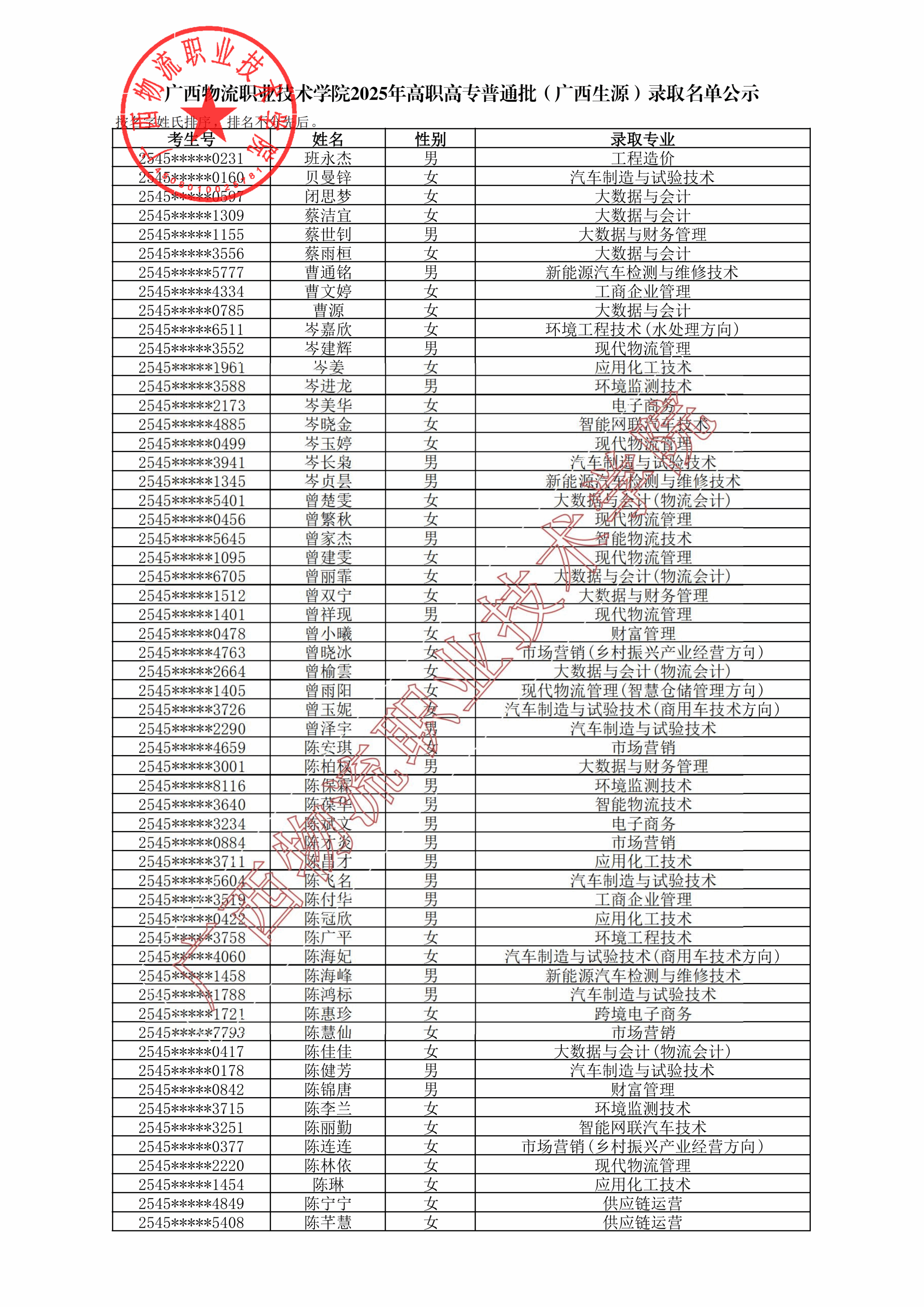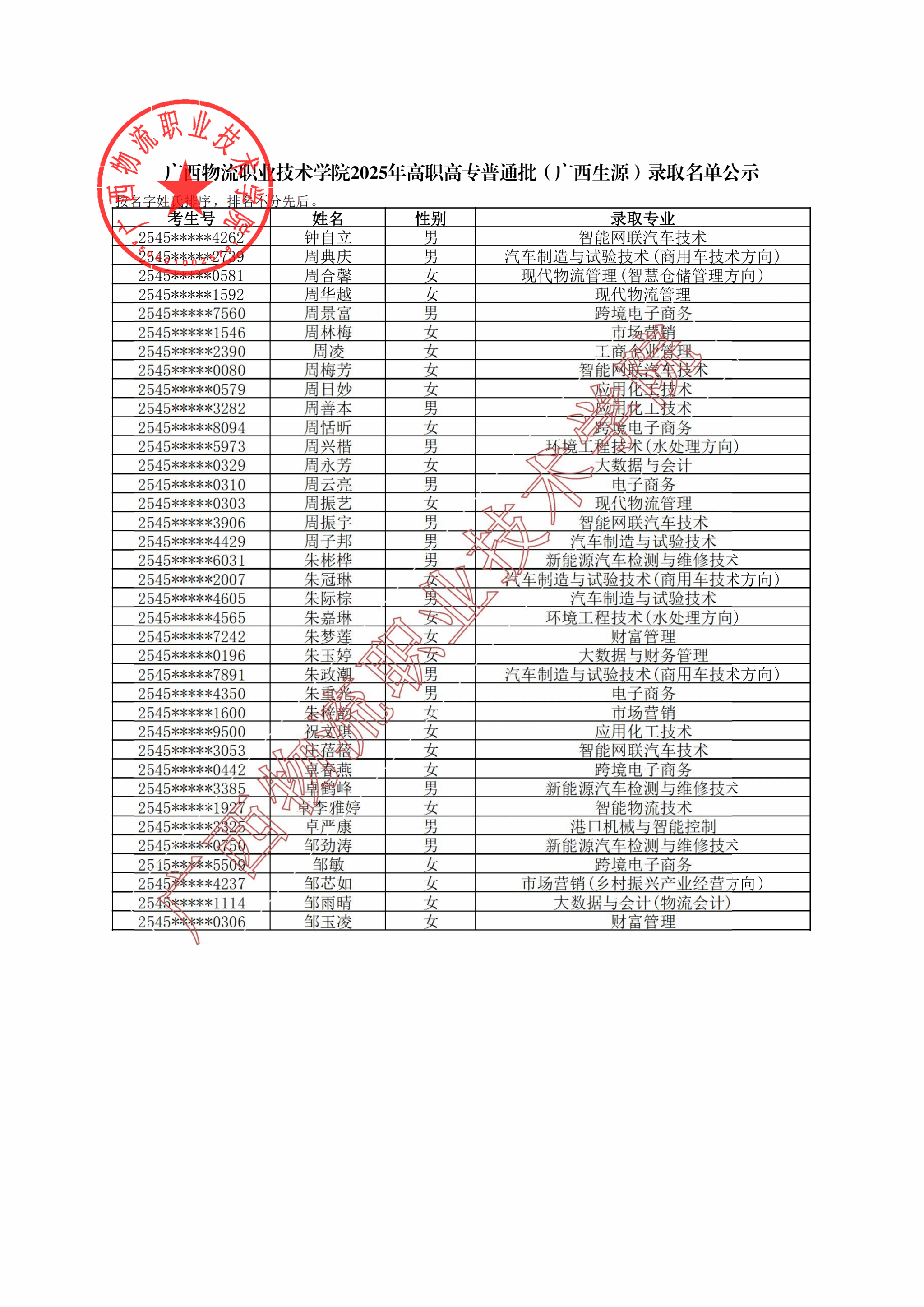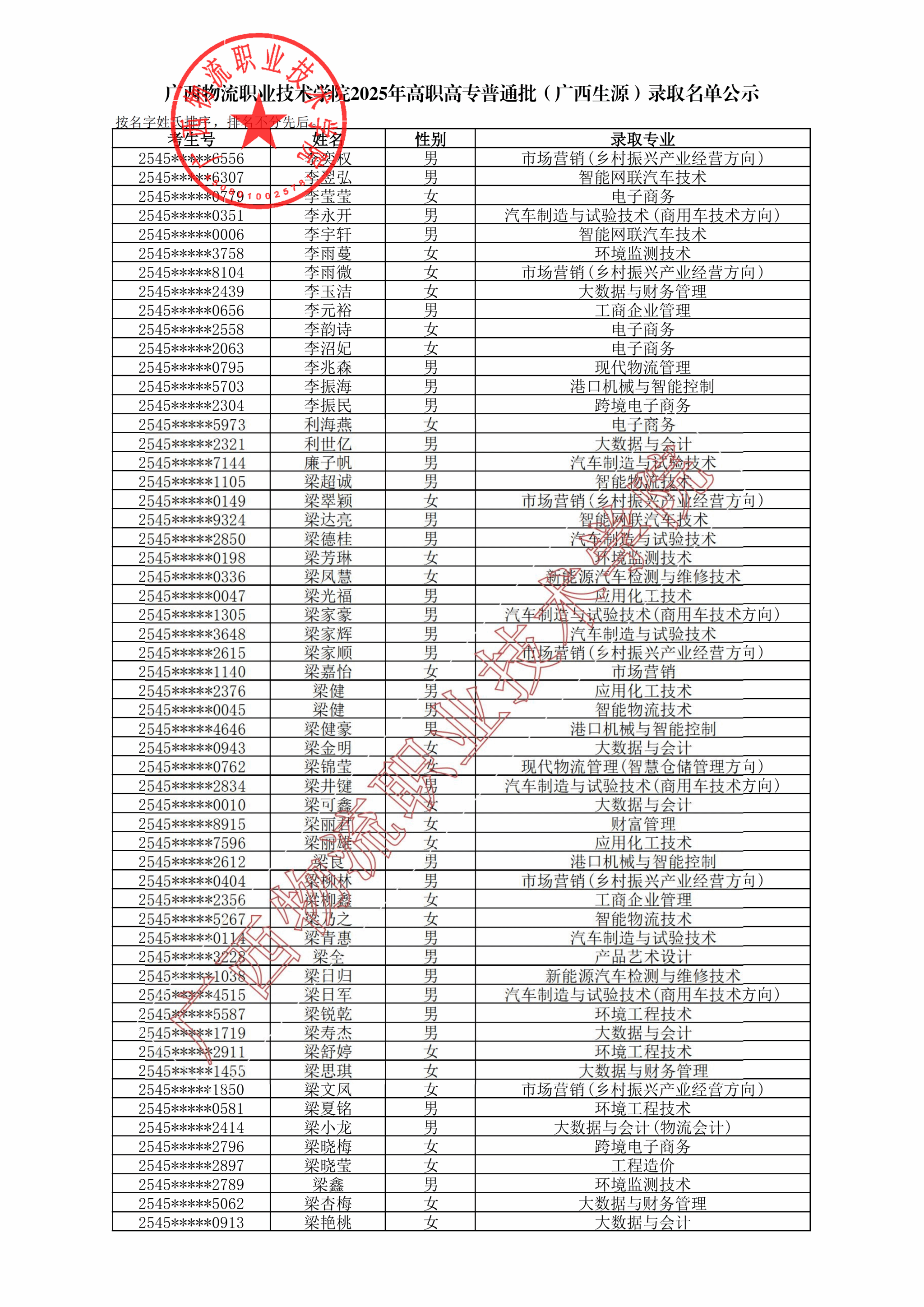 广西物流职业技术学院2025年高职高专普通批(广西生源)录取名单公示.pdf