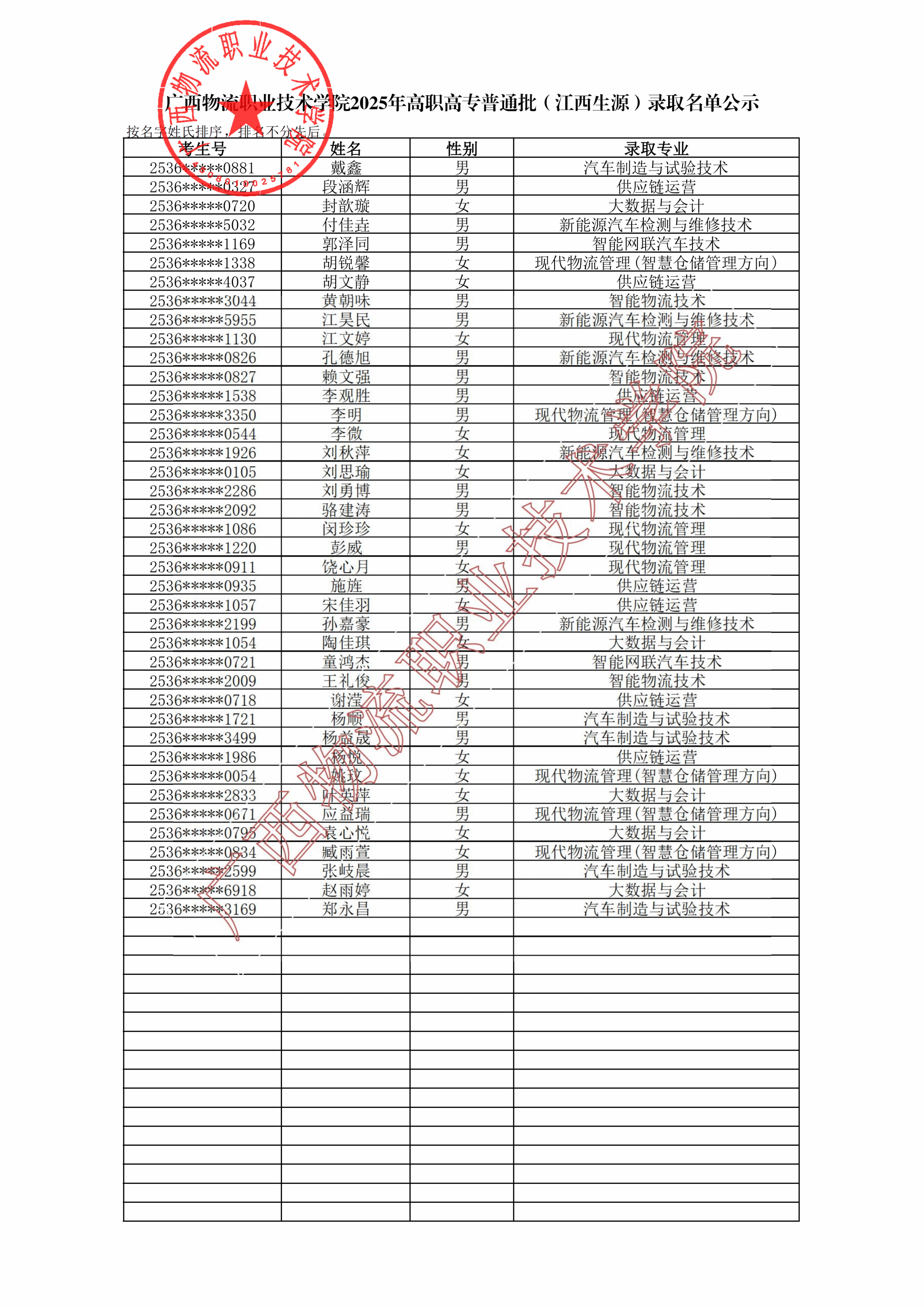 广西物流职业技术学院2025年高职高专普通批(江西生源)录取名单公示