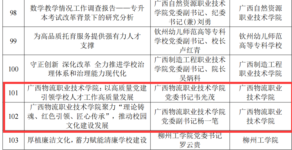 近日,自治区党委教育工委办公室下发了《关于公布2023年度广西高校党委理论学习中心组优秀品牌和优秀理论(调研)文章的通知》,我校《广西物流职业技术学院:以高质量党建引领学校人才工作高质量发展》、《广西物流职业技术学院聚力“理论铸魂、红色引领、匠心传承”,推动校园文化建设发展》两篇文章获评优秀理论(调研)文章。