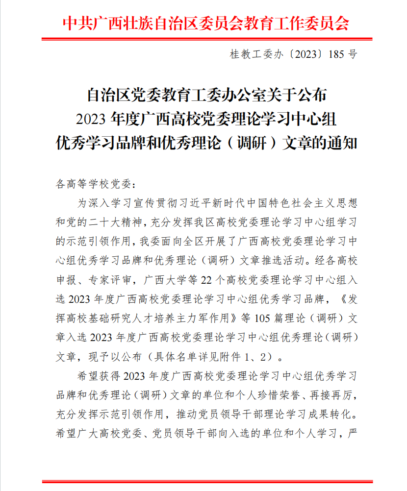 优秀!我校2篇文章入选2023年度广西高校党委理论学习中心组优秀理论(调研)文章!