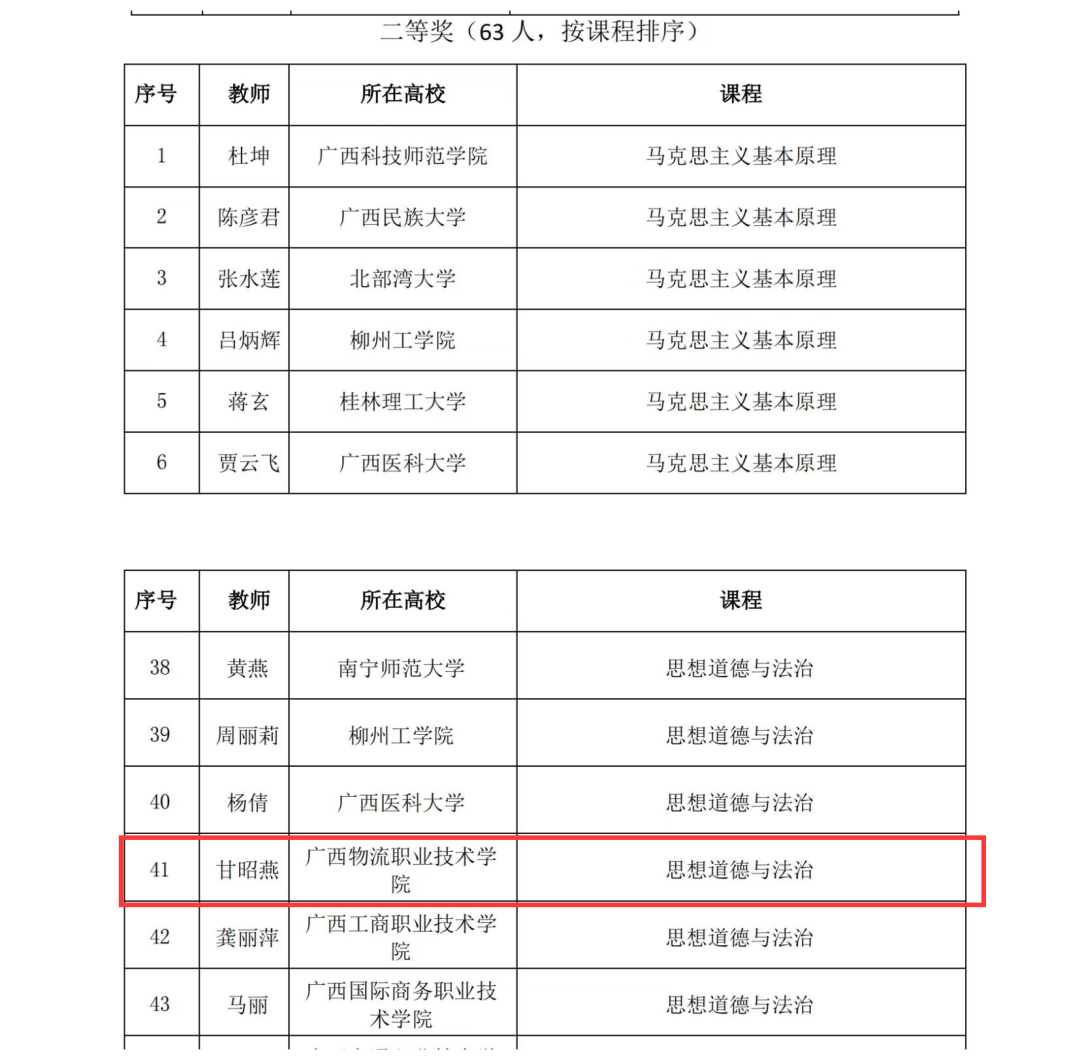 近日,自治区教育厅下发了《自治区教育厅关于公布2022年广西高校思想政治理论课教师基本功暨“精彩一课”比赛获奖名单的通知》,全区各高校共推荐222名教师参赛,其中青年组165名,教授组57名。我校马克思主义学院甘昭燕老师获得“思想道德与法治”课程青年组二等奖!