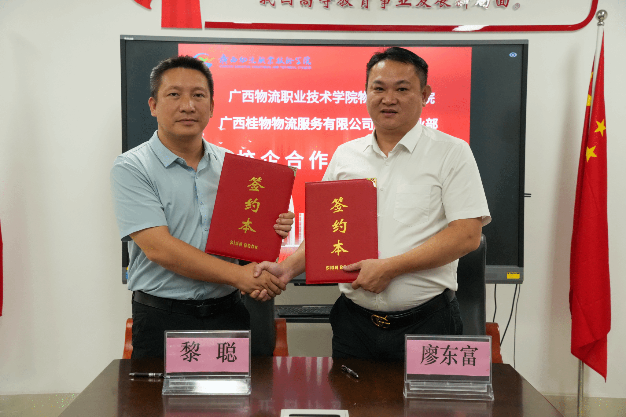 物流管理学院党支部书记、院长黎聪与桂物物流公司运输事业部党支部书记、总经理廖东富与代表双方签署校企合作协议。桂物物流公司运输事业部党支部组织委员兼宣传委员、副总经理林斌,物职院物流管理学院党支部副书记伍莹参加签约仪式。