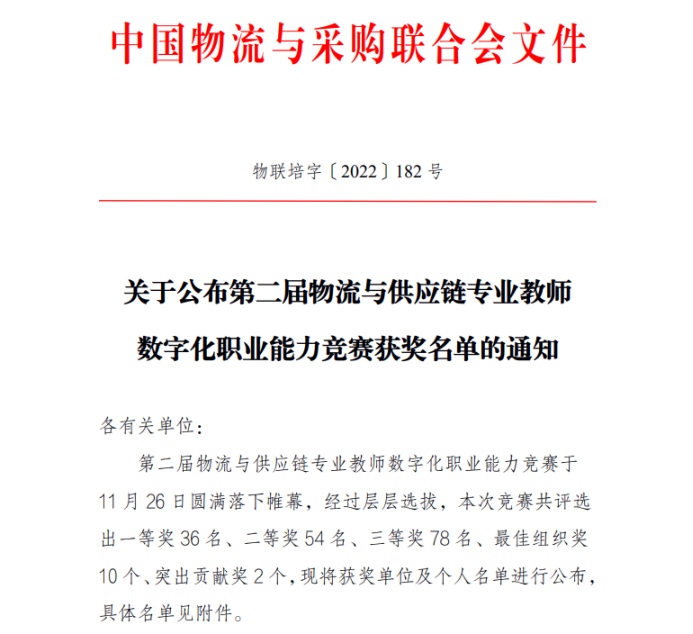 由中国物流与采购联合会主办的“数字转型 示范引领 以赛赋能”第二届物流与供应链专业教师数字化职业能力竞赛于12月2日圆满落幕。我校物流管理学院教师闫初宇、朱玮羚分别荣获职业教育供应链管理赛项二等奖、物流系统规划设计赛项二等奖。