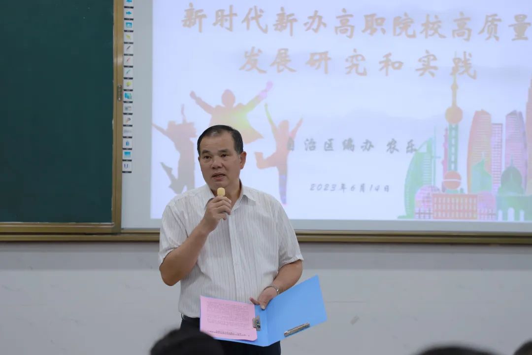 为不断强化内涵建设,积极探索形成新时代高职教育高质量发展的新实践、新路径、新模式,2023年6月14日,中共广西壮族自治区机构编制委员会办公室原副主任农乐到我校开展“新时代新办高职院校高质量发展的实践与研究”专题讲座,学院党委副书记、院长朱海强主持讲座。纪委书记覃丽燕及教职工代表参加活动。