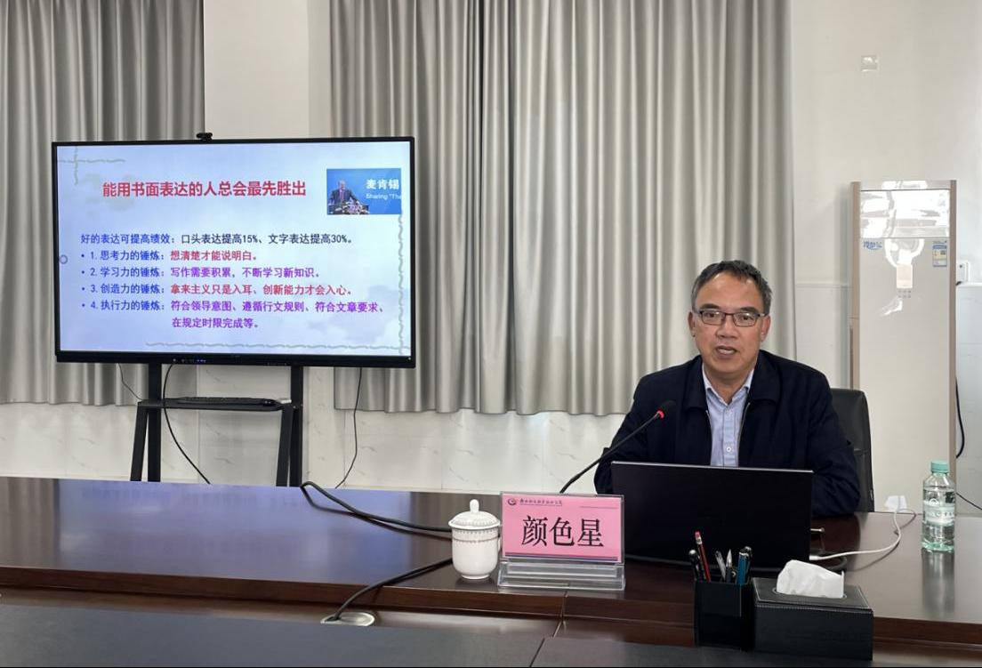 此次培训邀请广西写作协会理事、广西民族大学文学院颜色星老师,为教师们作题为《明规矩 想清楚 说明白——公文写作使用技巧》的授课。