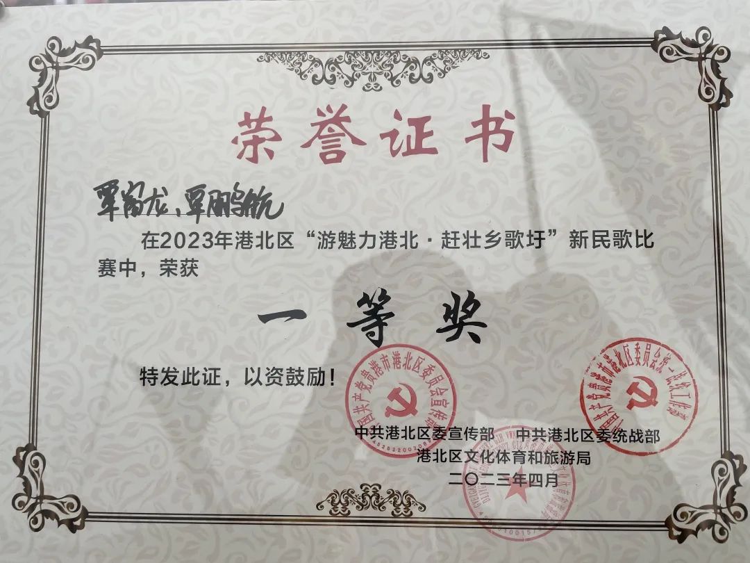 2023年4月21日,我校教师覃鹏航以原生态山歌《相见歌》参加“游魅力港北.赶壮乡歌圩”2023年广西贵港市港北区三月三新民歌比赛荣获一等奖。