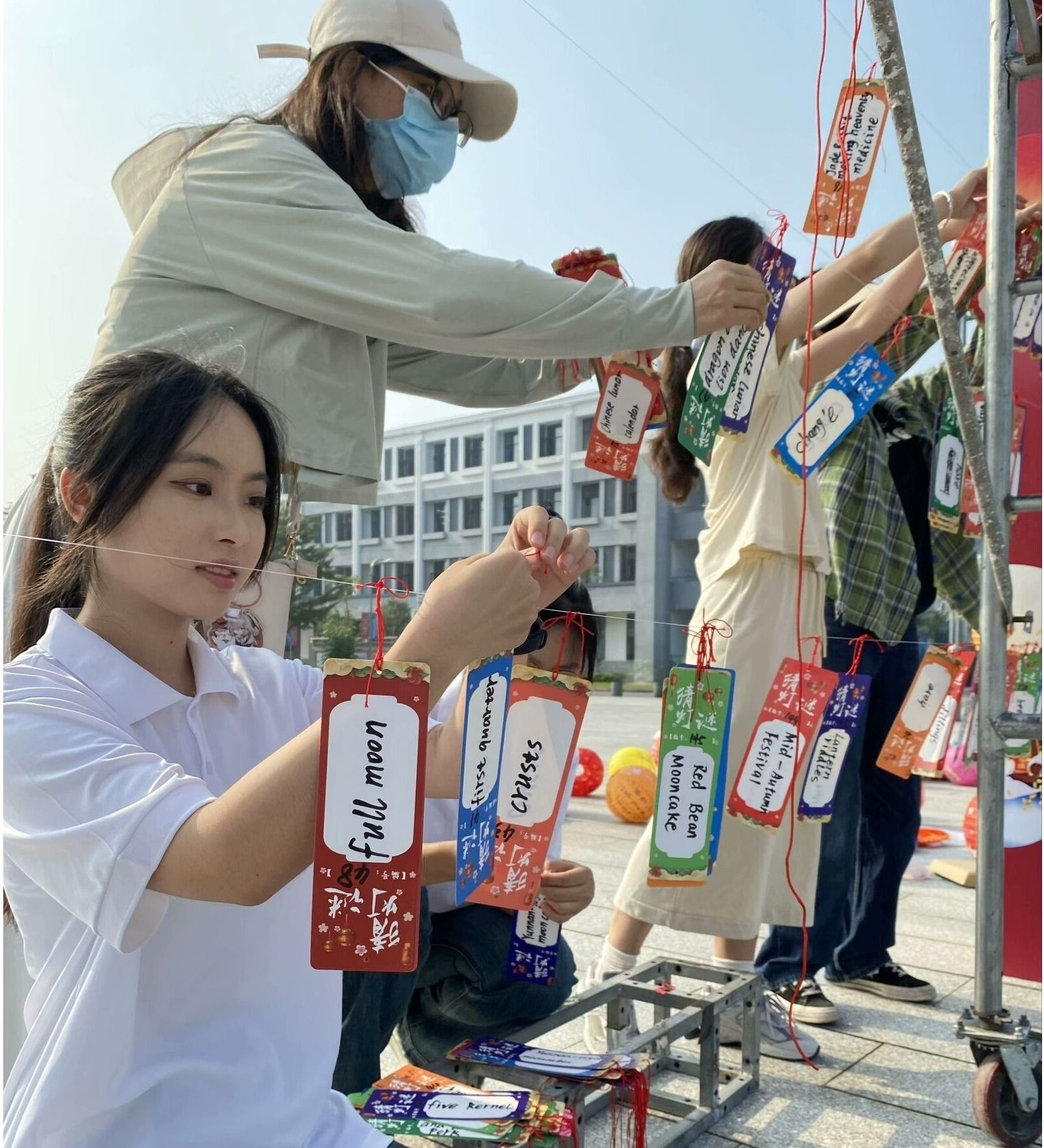在活动开始前,英语教研室的教师带领英语爱好者协会的志愿者们在朝阳普照下有条不紊布置场地,写灯谜、挂灯笼和系红绳,每个人都在期待着活动的开始。